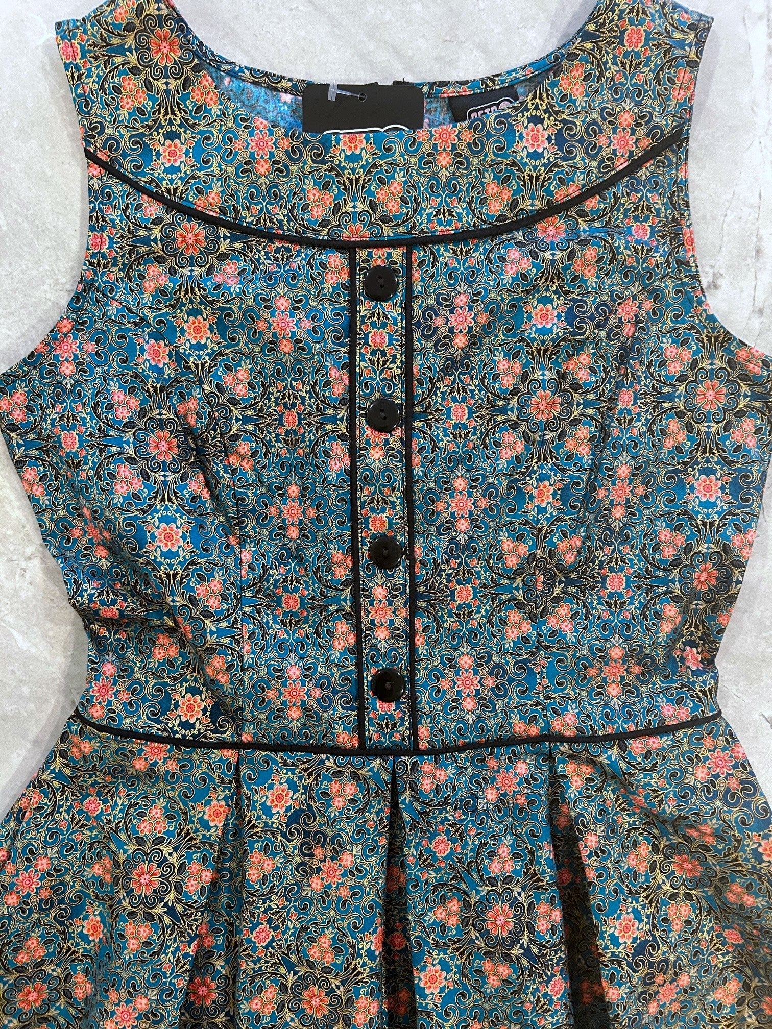 Looking for a classic vintage style dress? Our Elizabeth cut with all its details is everything you could want and more! Shown in our Serenity print, this cotton dress features piping details throughout the bodice with front non-functional buttons, waist with figure flattering pleats, a vintage inspired twirl-worthy skirt with hidden side pockets, and a back zippered closure.