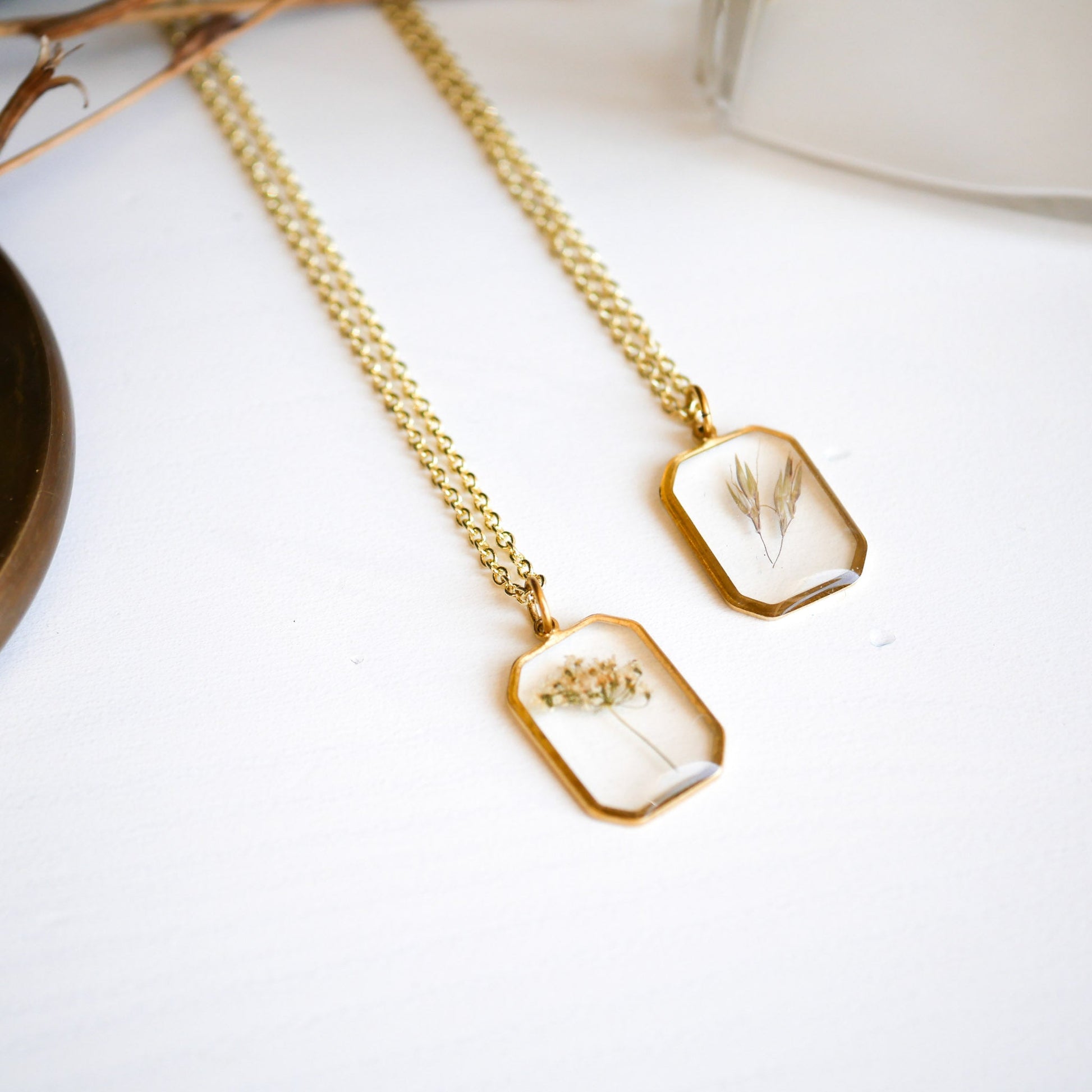 This sweet little mitered edge rectangle frame give the nostalgic feel of a locket, Choose from pressed Queen Annes lace or Meadow Grasses. The perfect necklace for everyday wear. The monochromatic look makes them easy to wear with any outfit!